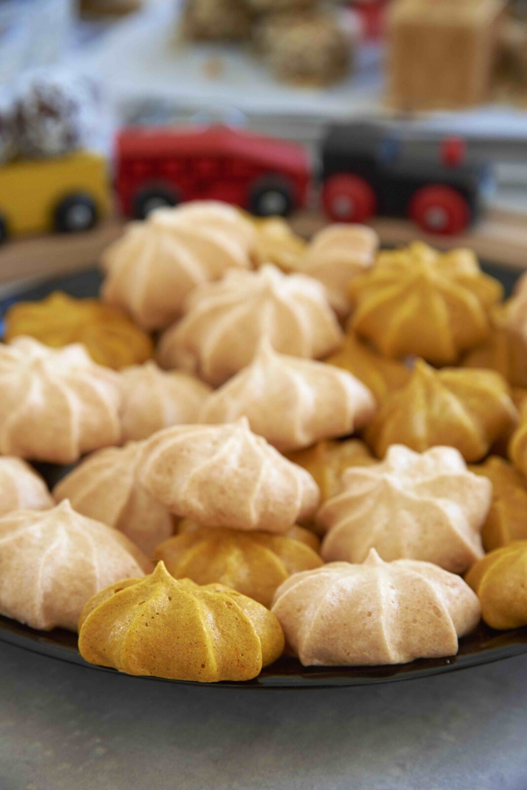 Pean tõdema, et neid beseeküpsiseid kurkumiga kollaseks värvides valdas mind kerge kahtlus. Kas põnnid saavad aru, et kollane värv on veits võõra maitsega? Huvitav, kas pean kõik kollased küpsised hiljem rõõmsalt prügikasti tõstma? Aus kahtlus, aga õnneks asjatu! Tegelikkus oli hoopis roosilisem ja kollased küpsised kadusid kandikult esimesena. Miks? Sest need värvisid keele ka kollaseks ja lastel oli jube lõbus kollaseid keeli võrrelda ja mõõta, kellel on pikem ja kollasem. 😀