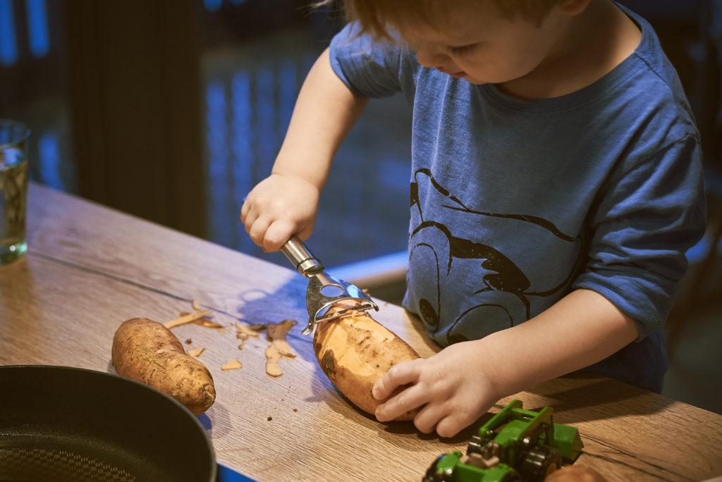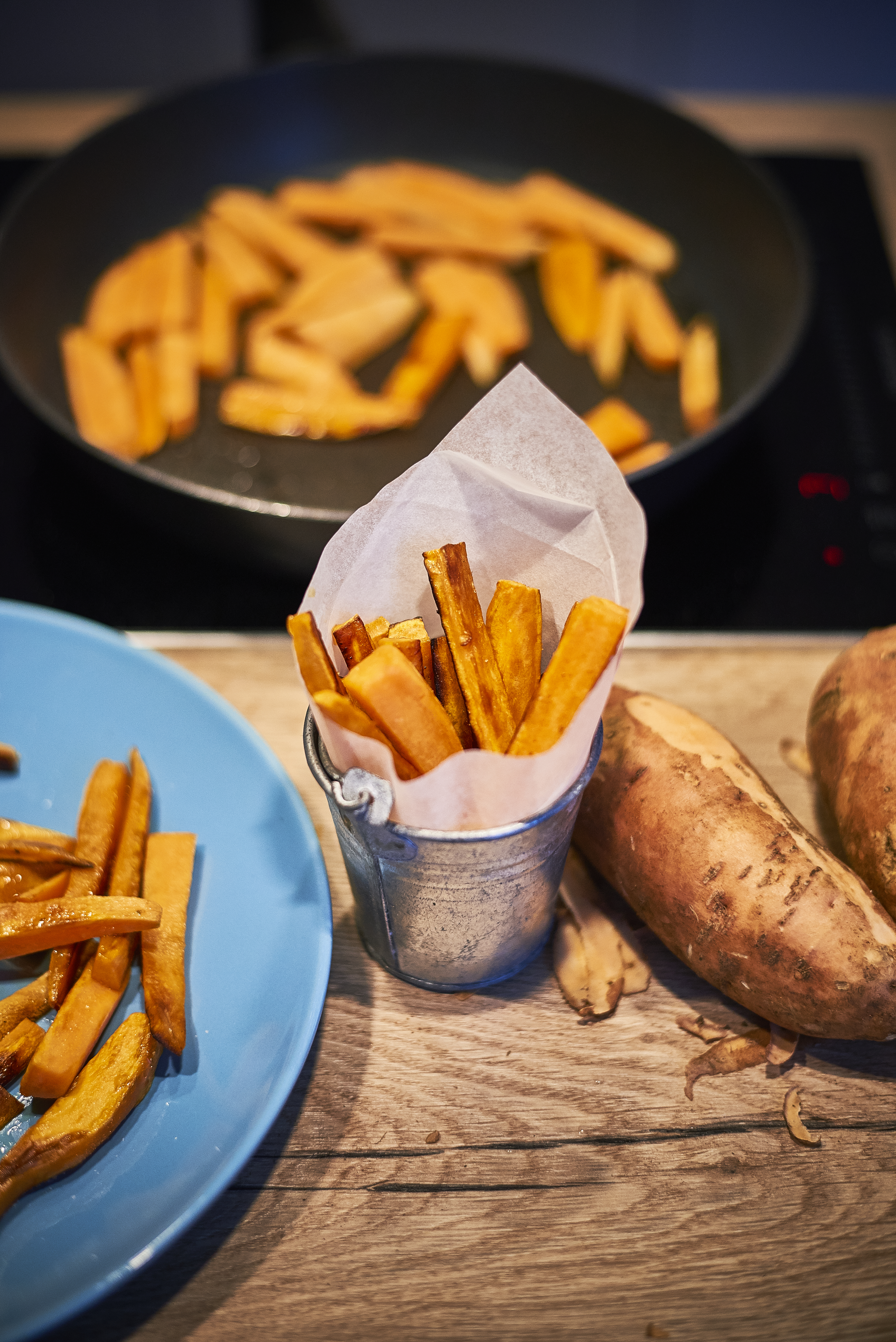 Koori bataat ja lõika kangideks. Lisa pannile õli ning prae bataaditükke 10–15 minutit keskmisel kuumusel, neid igalt küljelt