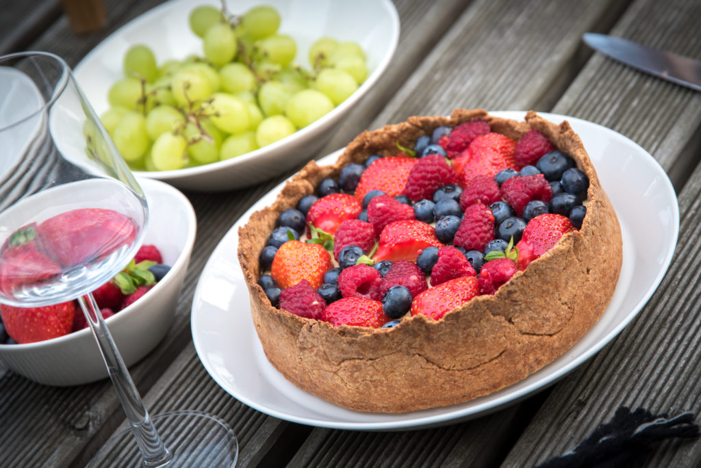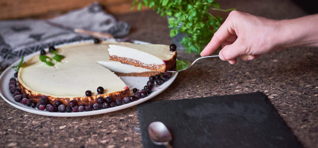 Pane jahu, sool, palmisuhkur ja külma või tükid köögikombaini ja purusta ühtlaseks puruks. Lisa muna ja sega hoolikalt läbi. Vormi taignast pall ning lase kapis seista umbes 30 minutit. Pane ahi sooja 190 kraadi peale. Vooderda koogivorm küpsetuspaberiga ja suru taigen lahtikäiva koogivormi põhja. Täidiseks sega kokku kõik koostisosad ning kalla taignale. Küpseta ahjus 25 minutit 190 kraadi juures. Võta kook ahjust välja ja lase enne serveerimist vähemalt 30 minutit jahtuda. Serveeri koos värskete marjade või marjakastmega.