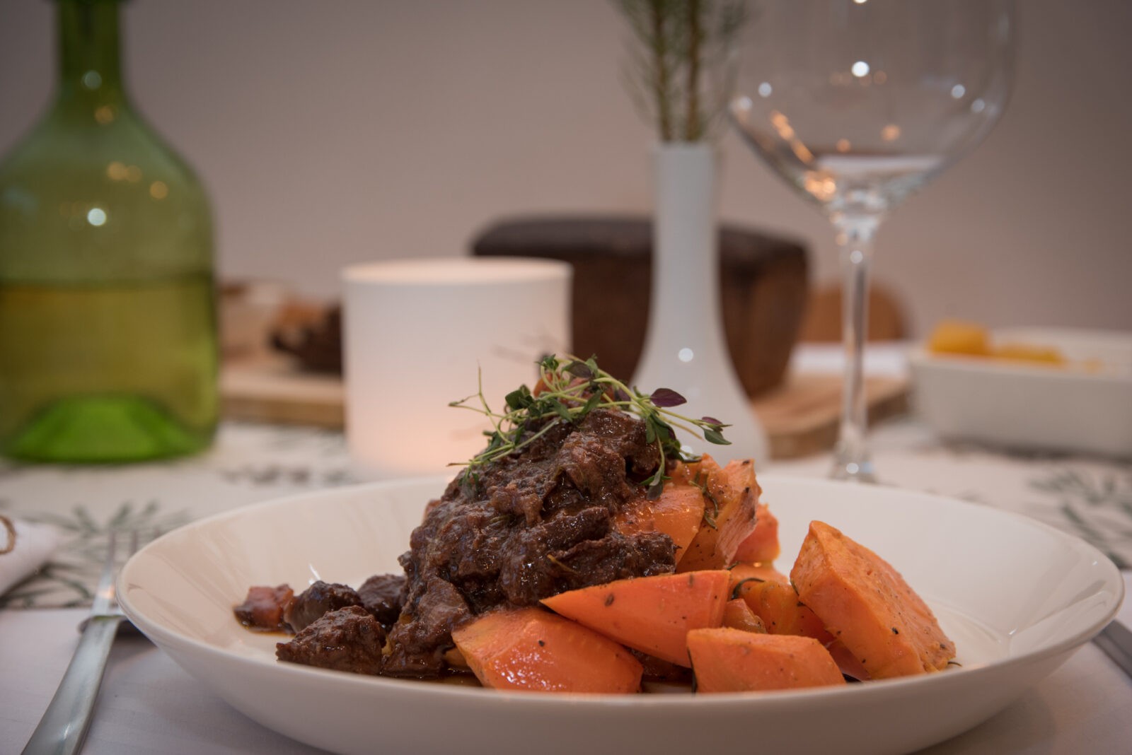 Kui steigiks sobib välis- või sisefileetükk, siis paja saab keeta peaaegu, et ükskõik millisest lihatükist. Mina kasutasin sel korral metssea jalga – kondist keetsin puljongi ning lihast paja. Eelnevatel kordadel olen kasutanud ka näiteks abatükki. Punase veini kastmel on kombeks vahel liiga hapuks muutuda, seega oma pajale lisasin musti ploome, et maitse oleks mõnusalt mahe, aga säiliks veinine mekk.