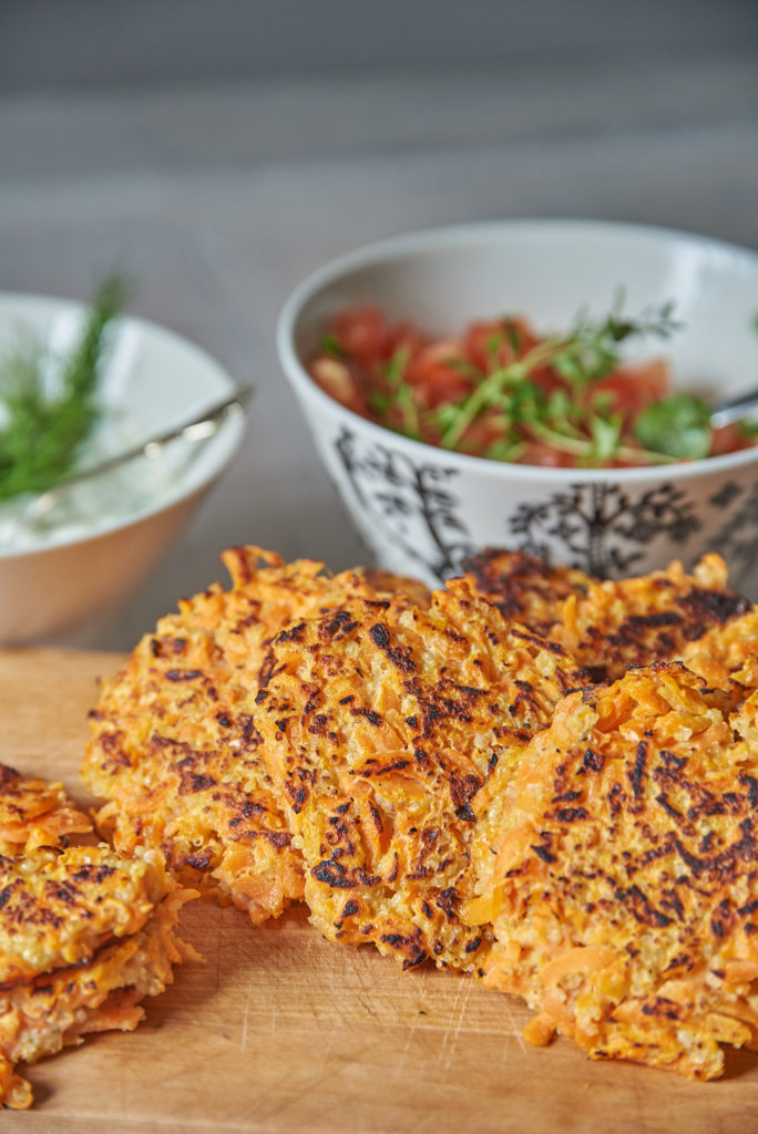 Koori porgandid ja keeda neid kuumas vees 10 minutit. Lase neil veidi jahtuda ja seejärel riivi need jämeda riiviga. Klopi kausis lahti munad koos maitseainete ja sinepiga. Pressi hulka küüslauguküüs ja sega. Lisa kaussi porgand, kinoa ja toortatrajahu ning sega hoolikalt läbi. Vormi segust peopesa suurused kotletid ja prae neid oliivõlis mõni minut kummaltki poolt, kuniks kotletid on mõnusalt pruunistunud ja läbiküpsenud. Serveeri tomatisalsa ja tilli-majoneesikastmega.