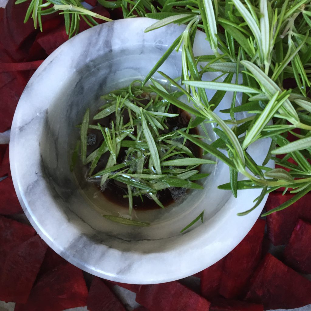 Valmistamine: Eelsoojenda ahi 180 kraadi peale. Koori toores peet ning haki umbes 5 mm paksusteks tükkideks. Laota tükid küpsetuspaberiga kaetud ahjuplaadile. Valmista marinaad uhmris, lisades sinna korraga oliivõli, balsamico, rosmariini, soola, pipraja agaavisiirupi. Pressi uhmriga koostisained segamini, rosmariini kergelt purustades. Kalla marinaad peedile ja tõsta hoolikalt segamini nii, et kastmega saaksid kokku kõik peedi tükid. Jaota tükid ahjuplaadil ühtlaselt ühes kihis laiali ja tõsta peetidega kaetud plaat ahju küpsema. Küpseta 180 kraadi juures ca 25 minutit või seni, kuni peedid on parajalt pehmed aga krõmpsud. Sõltuvalt ahjust võib küpsetusaeg olla veidi lühem või veidi pikem, seega maitse aegajalt peedi tükke ja küpseta seni, kuni küpsusaste on Sinule sobiv.