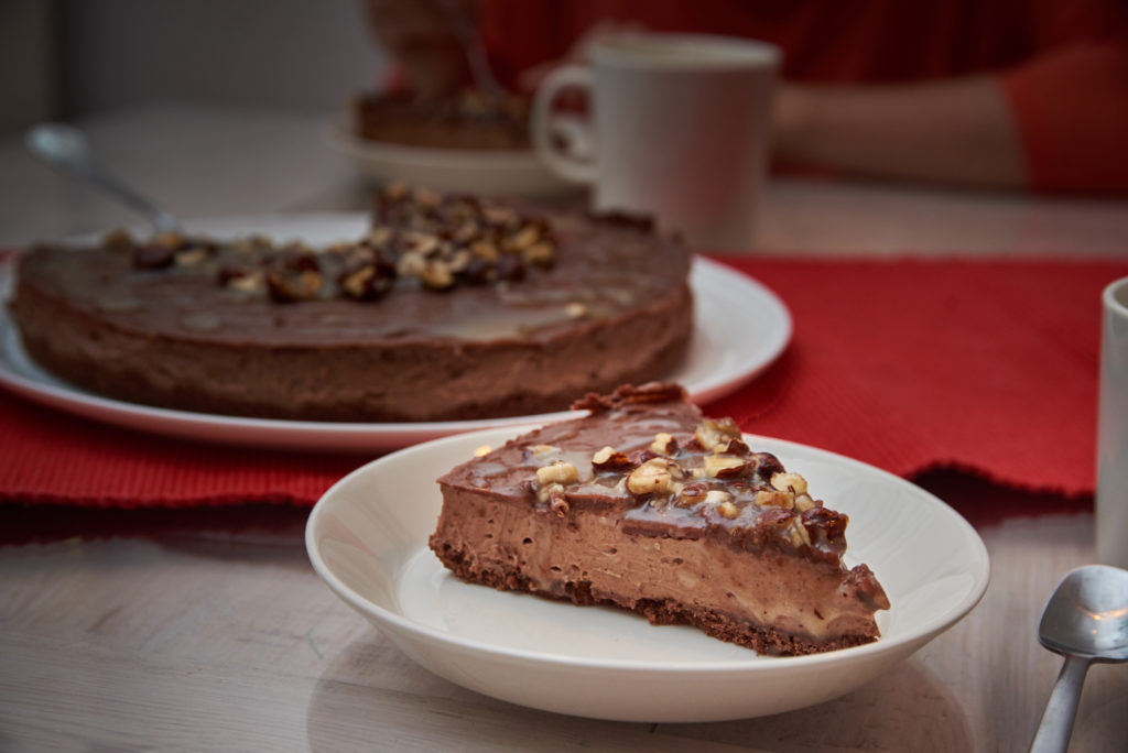 Pane likku zelatiinilehed. Täidiseks sega kokku toorjuust, agaavisiirup, palmisuhkur, toorkakao ja vanilje essents. Vahusta munavalge tugevaks vahuks. Lahusta zelatiinilehed kuumas vees ning sega toorjuustukreemi hulka. Kõige lõpus sega kreemi hulka munavalge vaht ja kalla kreem küpsisepõhjale. Lase põhjal vähemalt 2 h külmas tarduda (või üleöö).
