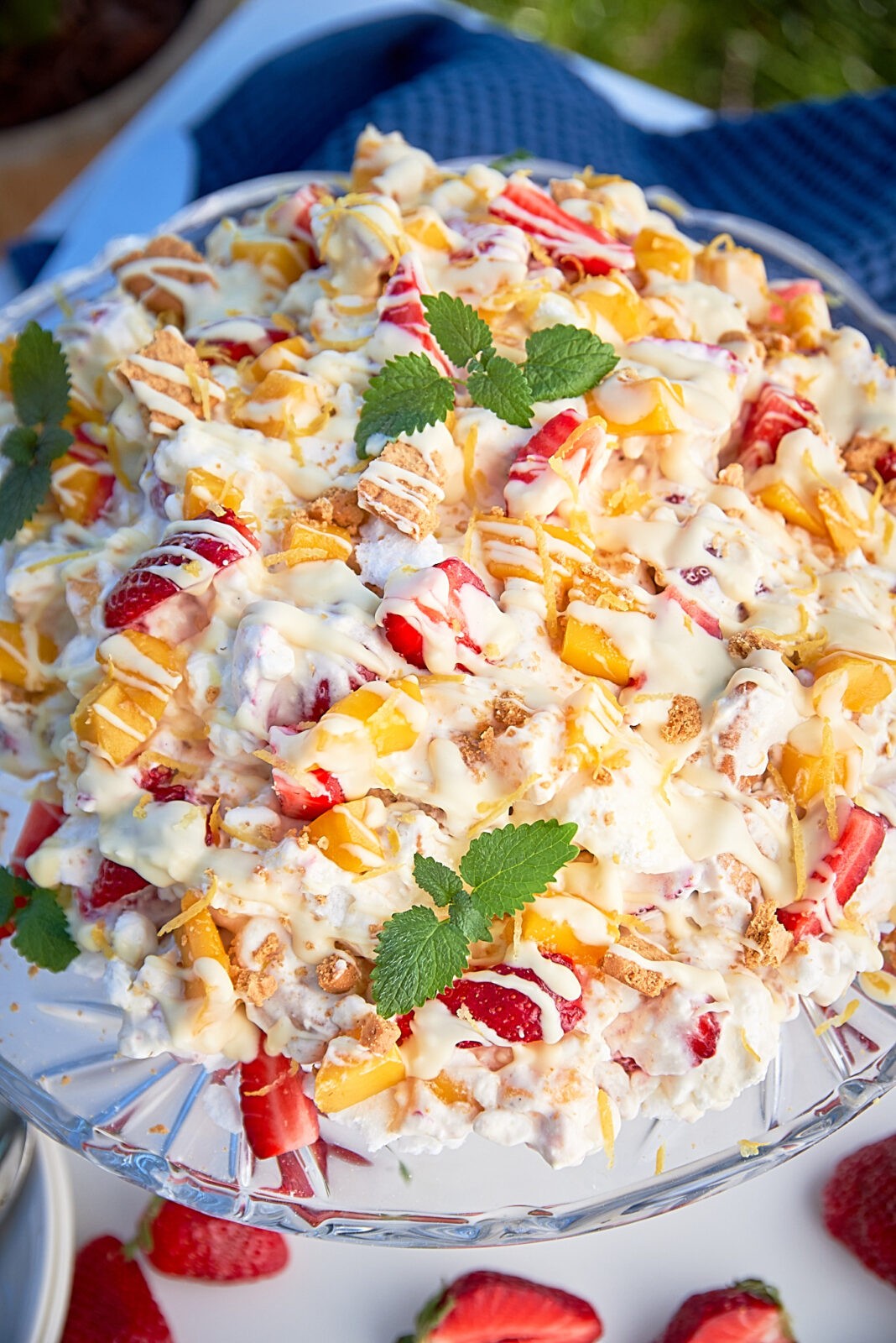 Koori ja tükelda mango ning lõika maasikad sektoriteks. Sulata valge šokolaad veevannil. Vahusta vahukoor, sega ettevaatlikult hulka kodujuust, agaavisiirup, vanillisuhkur ja riivitud sidrunikoor. Lisa vahukoore segule tükeldatud mango ja maasikad, purusta hulka digestiivküpsised ja beseepõhi ning tõsta segamini. Kalla kõik serveerimisalusele ühte hunnikusse ja puista soovi korral kaunistuseks peale mõned maasika-, mango- või küpsisetükid. Nirista kõik üle sulatatud valge šokolaadiga ja kaunista paari melissilehega. Naudi kohe!