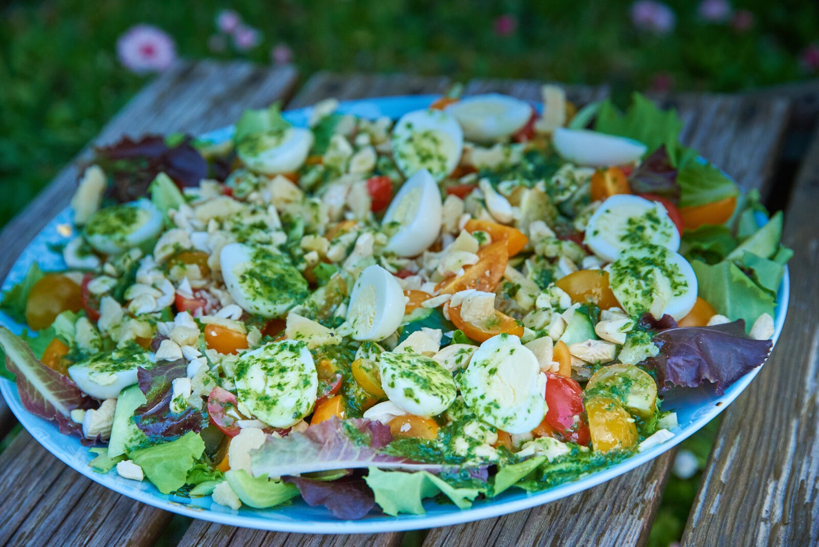 2. Laota salatilehed vaagnale. Haki kurk ja kirsstomatid sektoriteks ning laota salatilehtedele. Purusta pähklid kergelt noaga ning laota salatile. Viimasena pudista peale parmesani laastud, neid näppude vahel väiksemateks tükkideks purustades. Kõige peale aseta vutimuna poolikud.